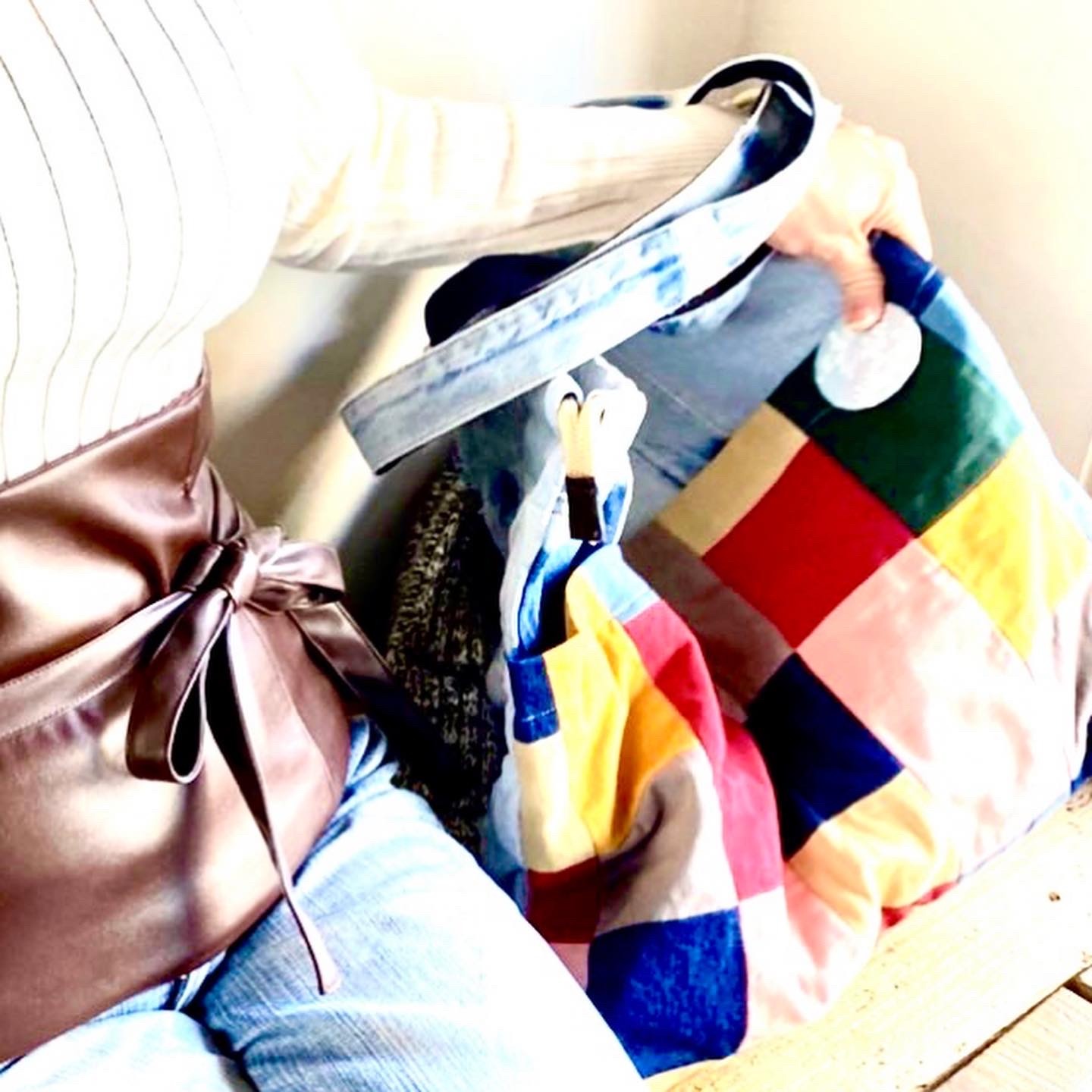 前面がカラフルパッチワークでポーチポケット付きのタイプ。