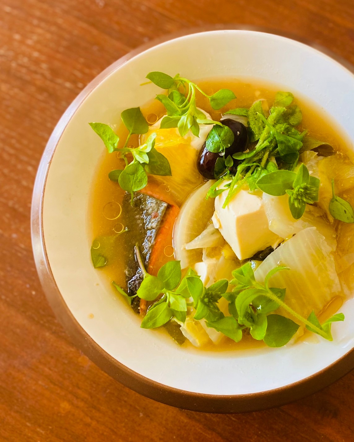 写真はハコベのお味噌汁。オリーブオイルをかけたものです。