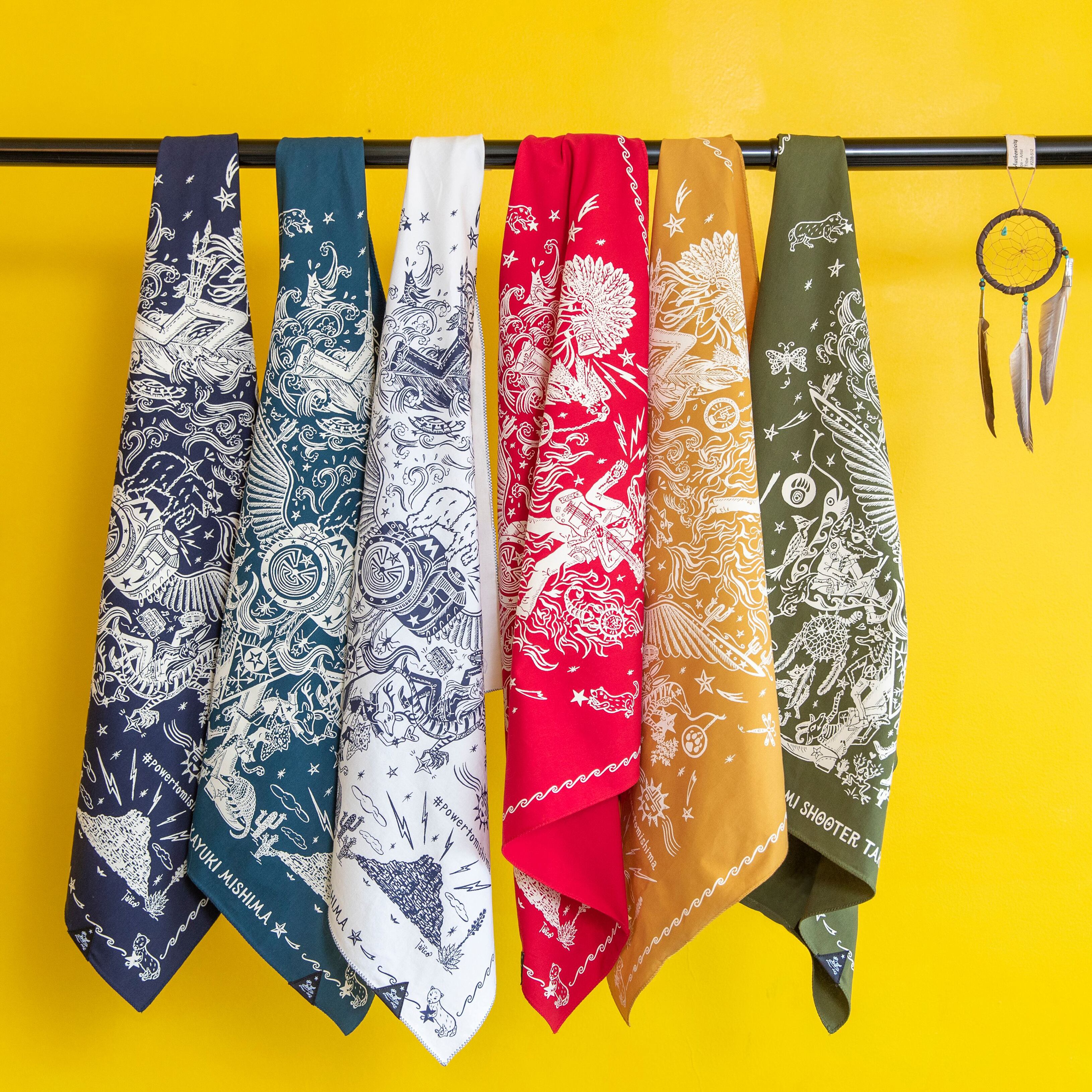 イラストの細部に至るまで、全て意味を持って描かれています。キュートでロックンロールなパワーあふれるスピリチュアルな世界は、三島タカユキや私たちにたくさんの応援とパワーを与えてくれました。そのパワーをそのままに、MyKindaLifeが、誰もがもてる御守りバンダナとして再び復活いたしました。